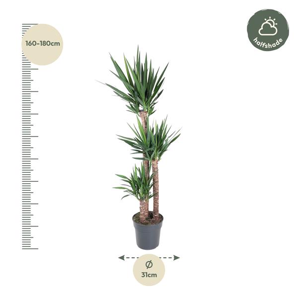 - Uiterlijk van de Yucca Elephantipe: De Yucca Elephantipe, ook wel bekend als de Olifantenpalm, heeft lange, smalle, donkergroene bladeren die uit een stevige stam groeien. De bladeren hebben scherpe uiteinden en vormen een sierlijke rozet. De stam is dik en verhout, en kan een robuuste uitstraling geven, wat de plant een tropische uitstraling geeft.